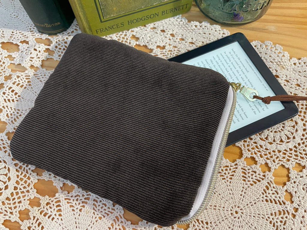 This corduroy e-reader cover is padded for protection and features a lovely, smooth, brass-finish zipper.