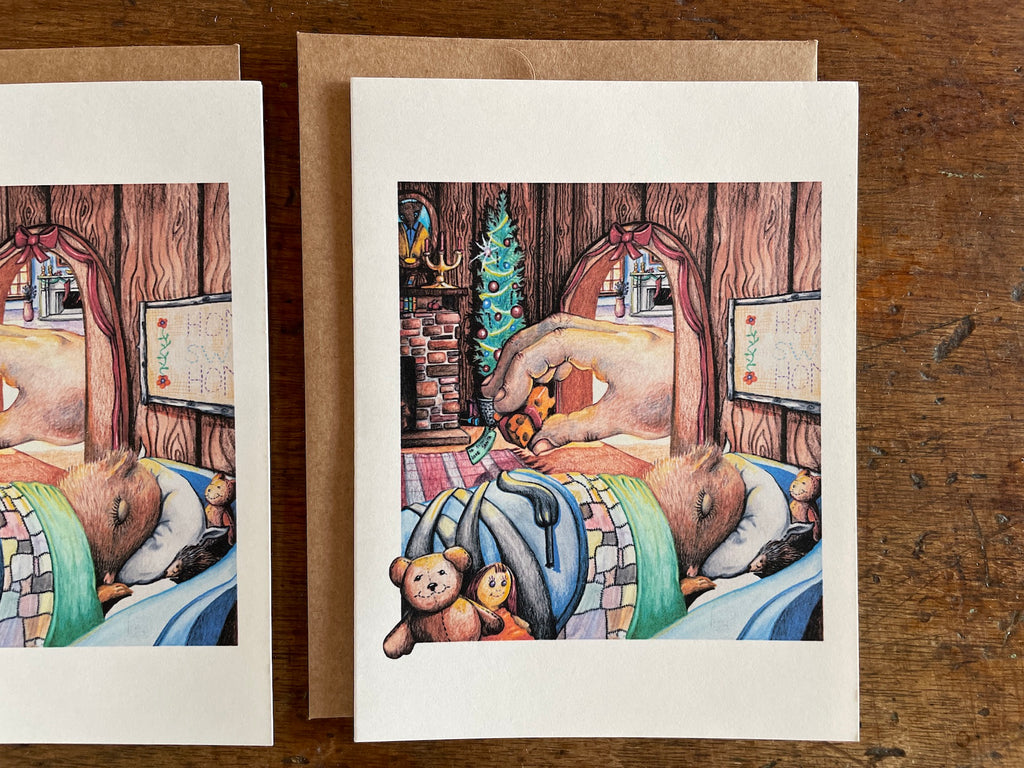 An adorable Christmas card with a traditional illustration of 'Twas the night before Christmas. Printed on a heavy-weight card stock, this is such a fun and festive card to send to your friends and family or use as a mini print for the holidays!